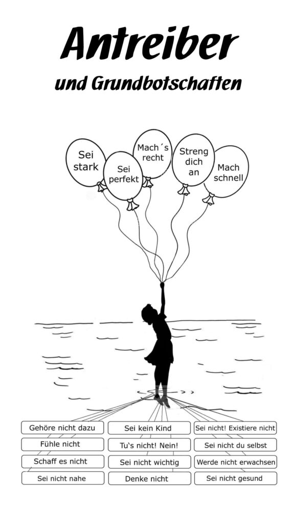 Antreiber sind innere Stimmen oder Muster, die wir in der Kindheit gelernt haben – meist durch Erwartungen oder ungeschriebene Regeln in der Familie. Sie treiben uns an, uns auf bestimmte Weise zu verhalten, zum Beispiel: